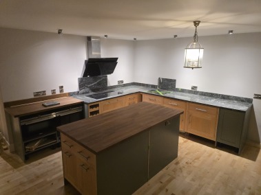 Solid maple doors and matching maple veneered carcasses Topped with Green granite and black bog oak worktops.